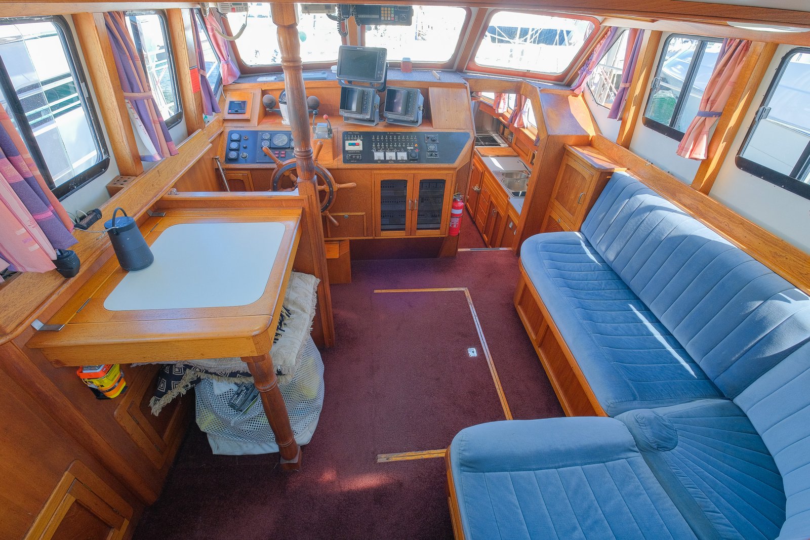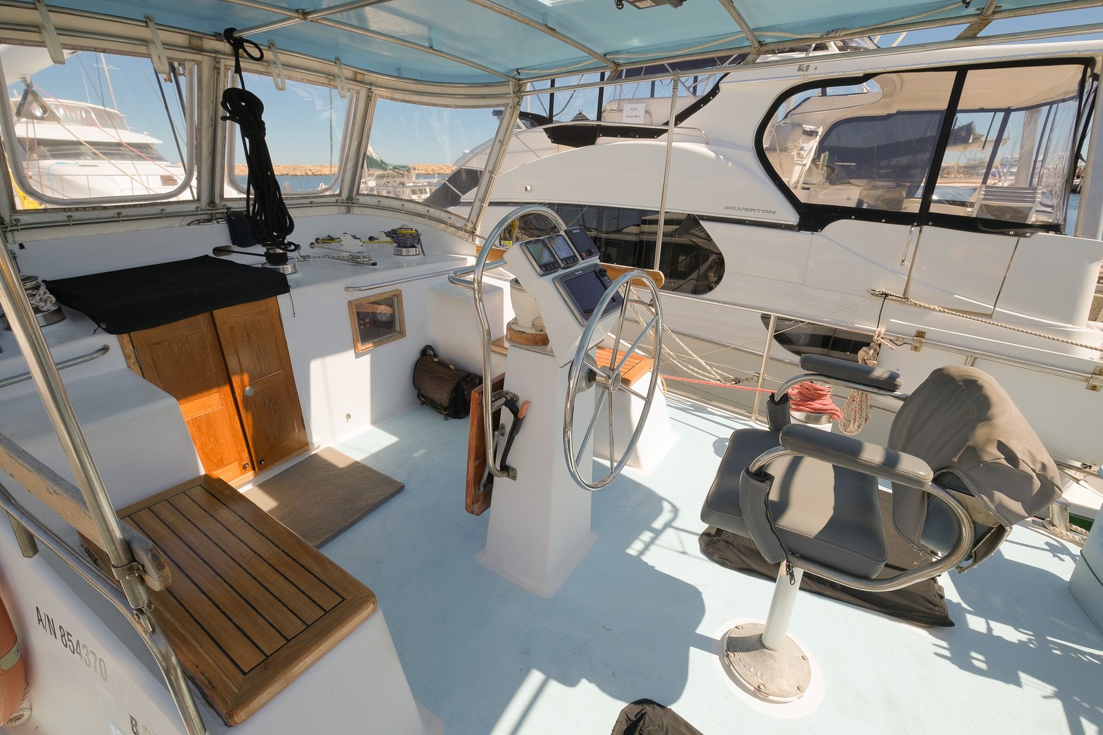 Step down the companionway and you enter the beautifully designed and fully equipped pilothouse — offering full protection from the elements and exceptional visibility. This space is a watch-keeper’s dream, featuring a secondary helm station that puts everything at your fingertips — from engine controls and systems monitoring, to navigation and communications, and autopilot — all surrounded by panoramic windows that offer incredible views and natural light, whether underway or at anchor.