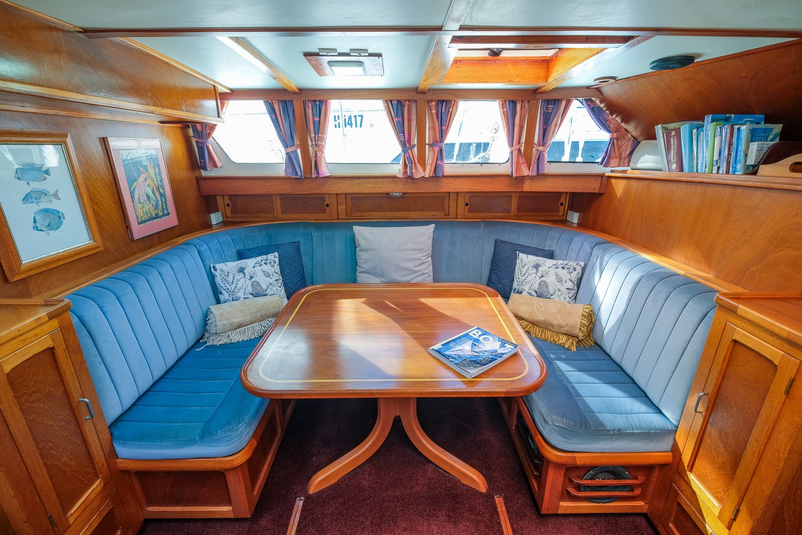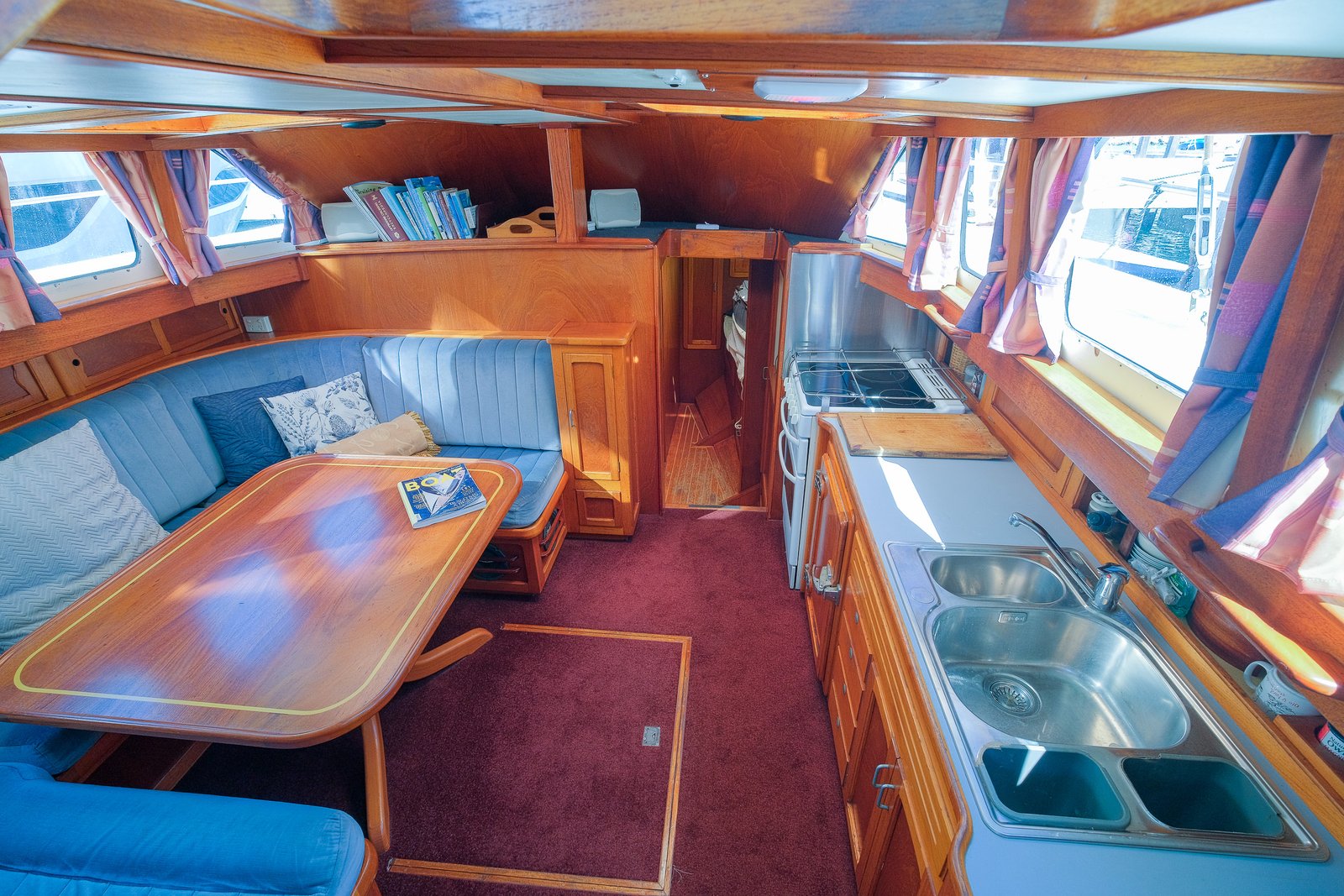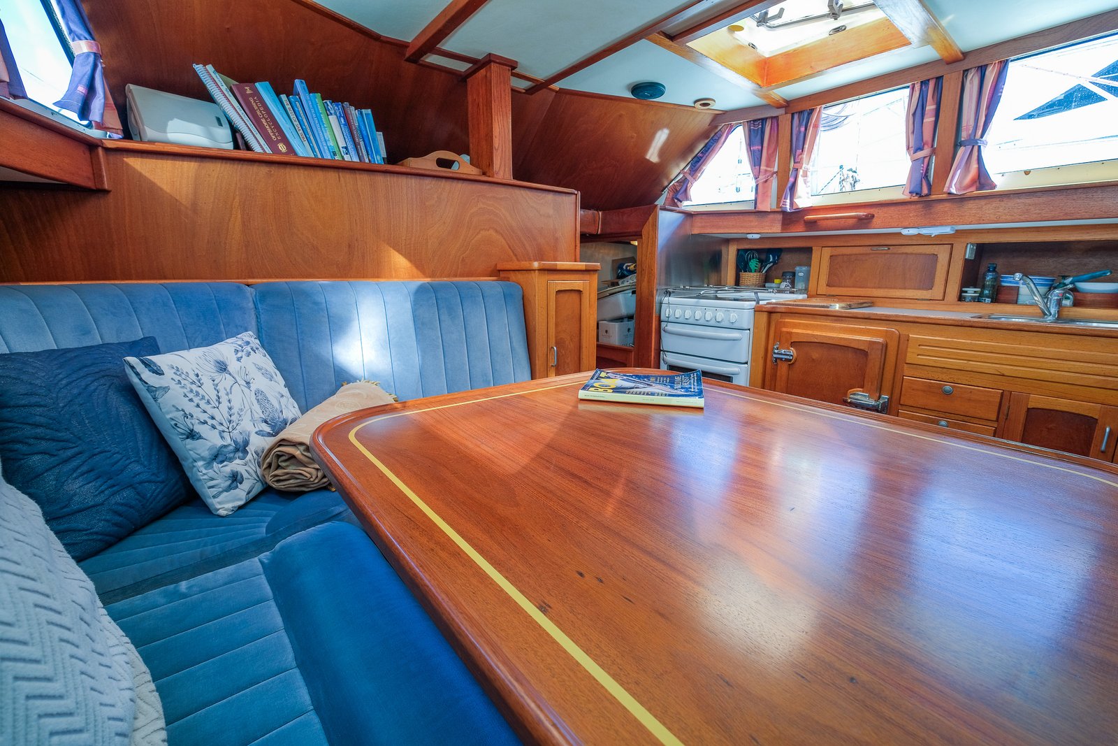 Moving forward from the pilothouse you enter the heart of Windstar — the main saloon and galley. The craftsmanship is immediately evident, with a stunning timber fitout showcasing Australian Red Cedar, Sapele, and Teak, creating a warm and inviting interior. At the centre of the space is a large handcrafted dining table, surrounded by a comfortable U-shaped settee, which also serves as a secure sea berth while underway.
