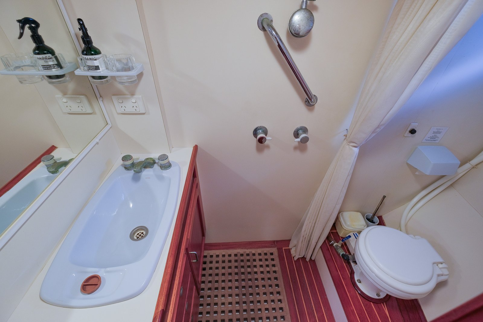 The private ensuite is impressively spacious, equipped with an electric head, and a separate stand-up shower cubicle — a highly desirable feature on a liveaboard cruising yacht.