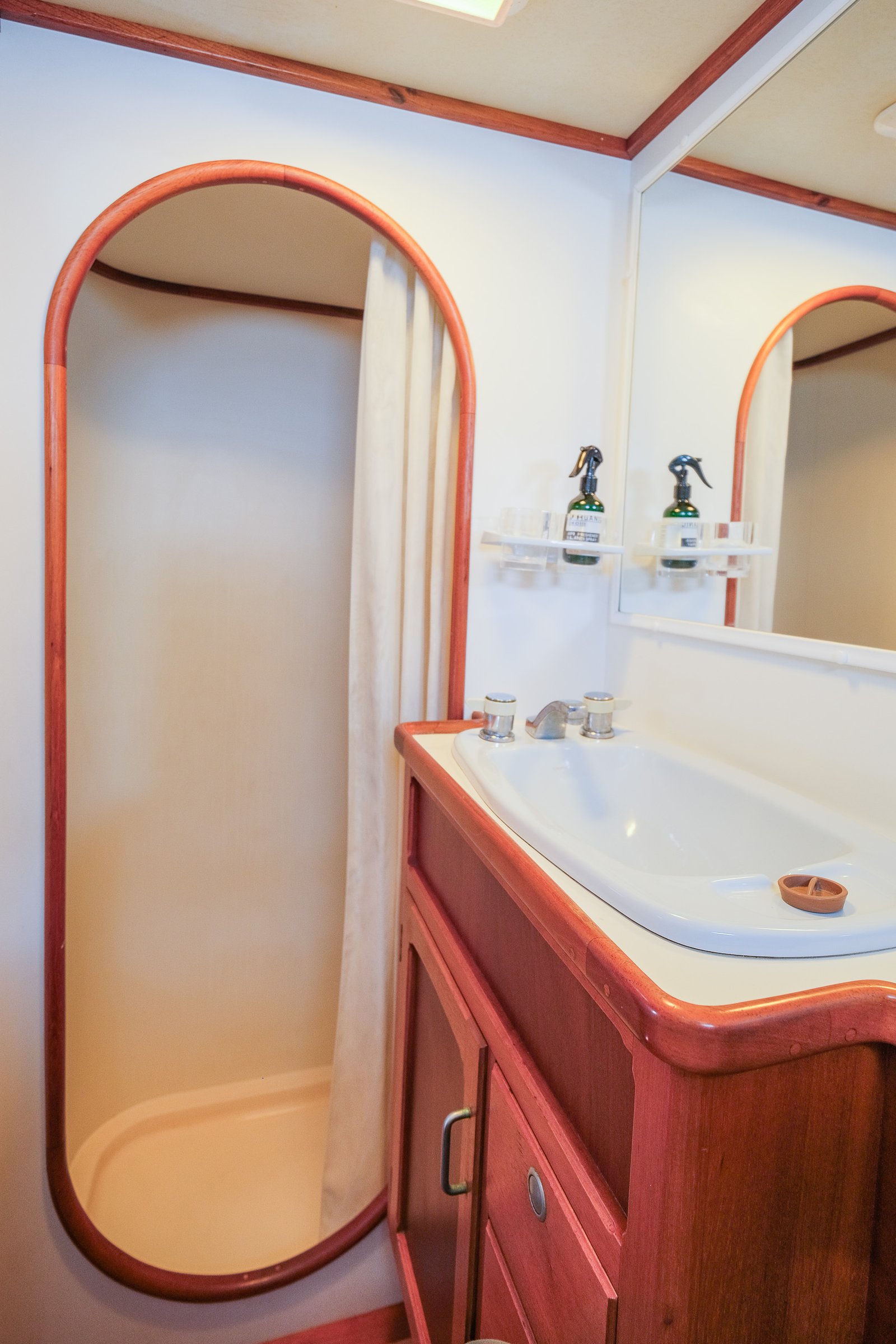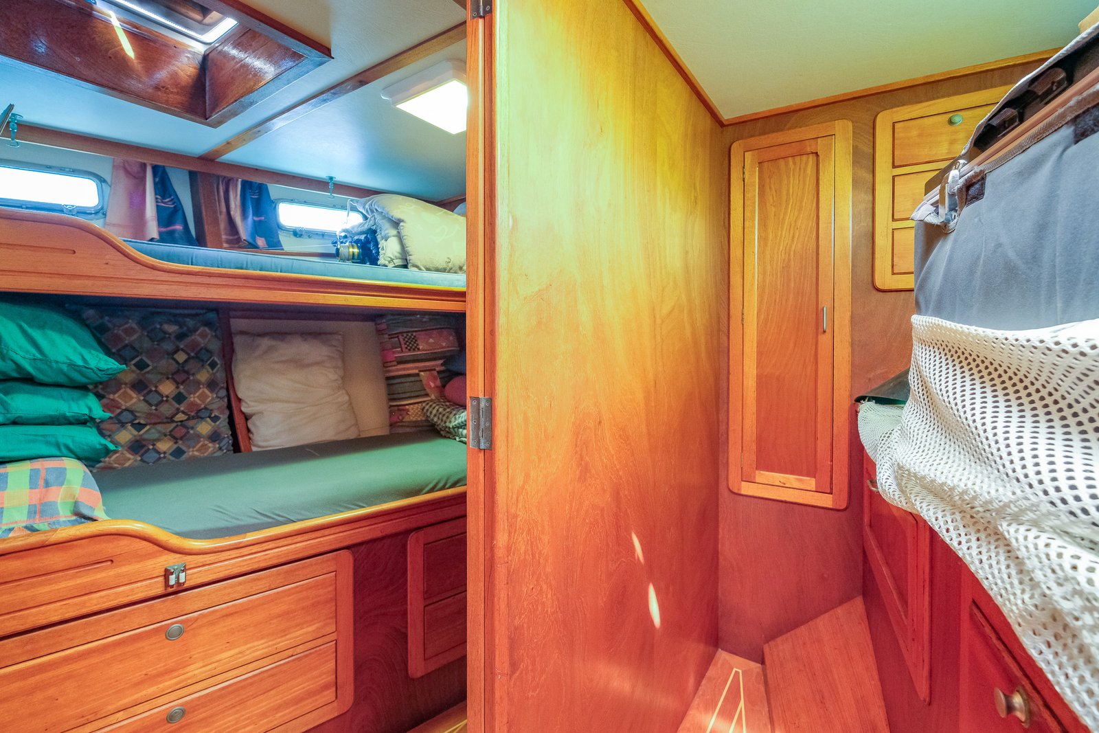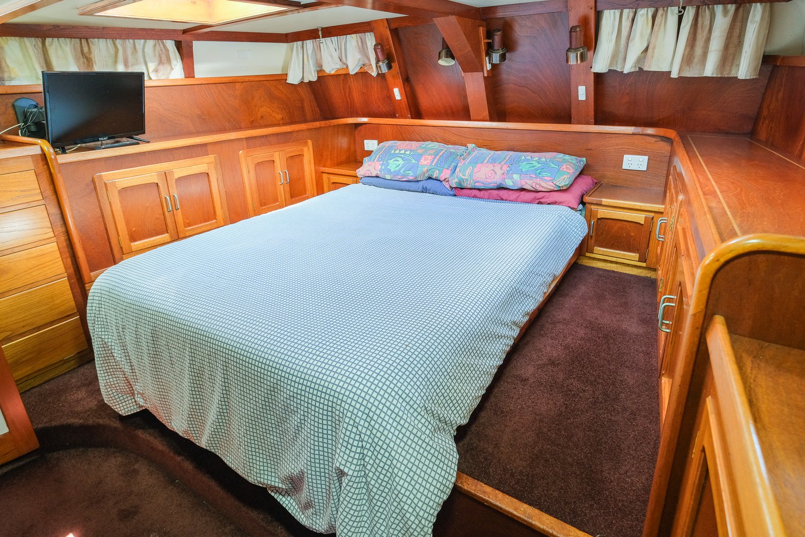 Located aft of the pilothouse, the master owner’s cabin is a true retreat at sea, featuring a full queen-size walkaround bed — the epitome of luxury. The cabin offers an outstanding amount of storage, with the bed surrounded by custom cabinetry, drawers, and generous hanging lockers, all beautifully crafted in rich warm timber. Two large overhead hatches flood the space with natural light and provide excellent ventilation, complemented by opening portholes in the hull that further enhance airflow and ambiance.