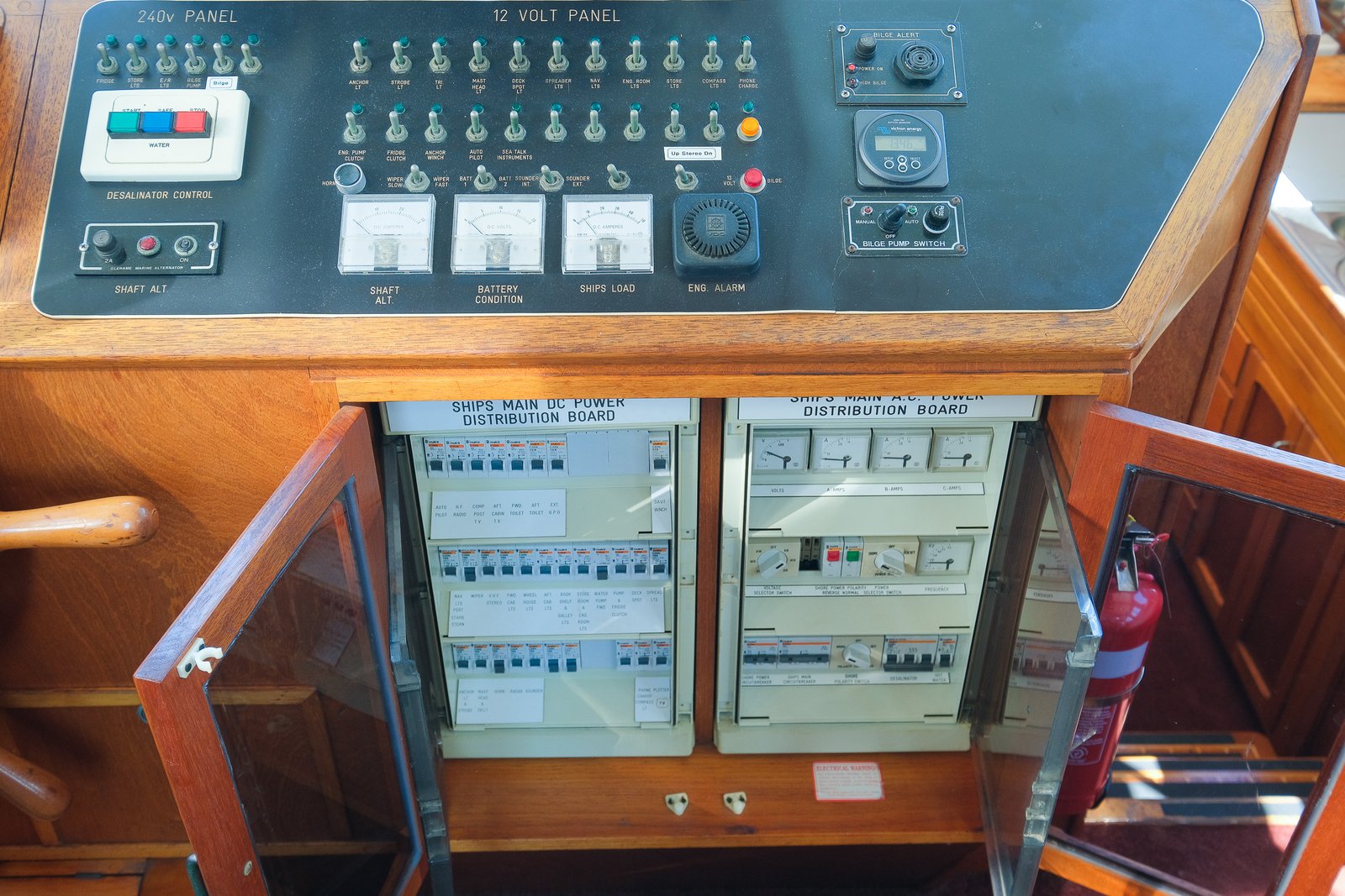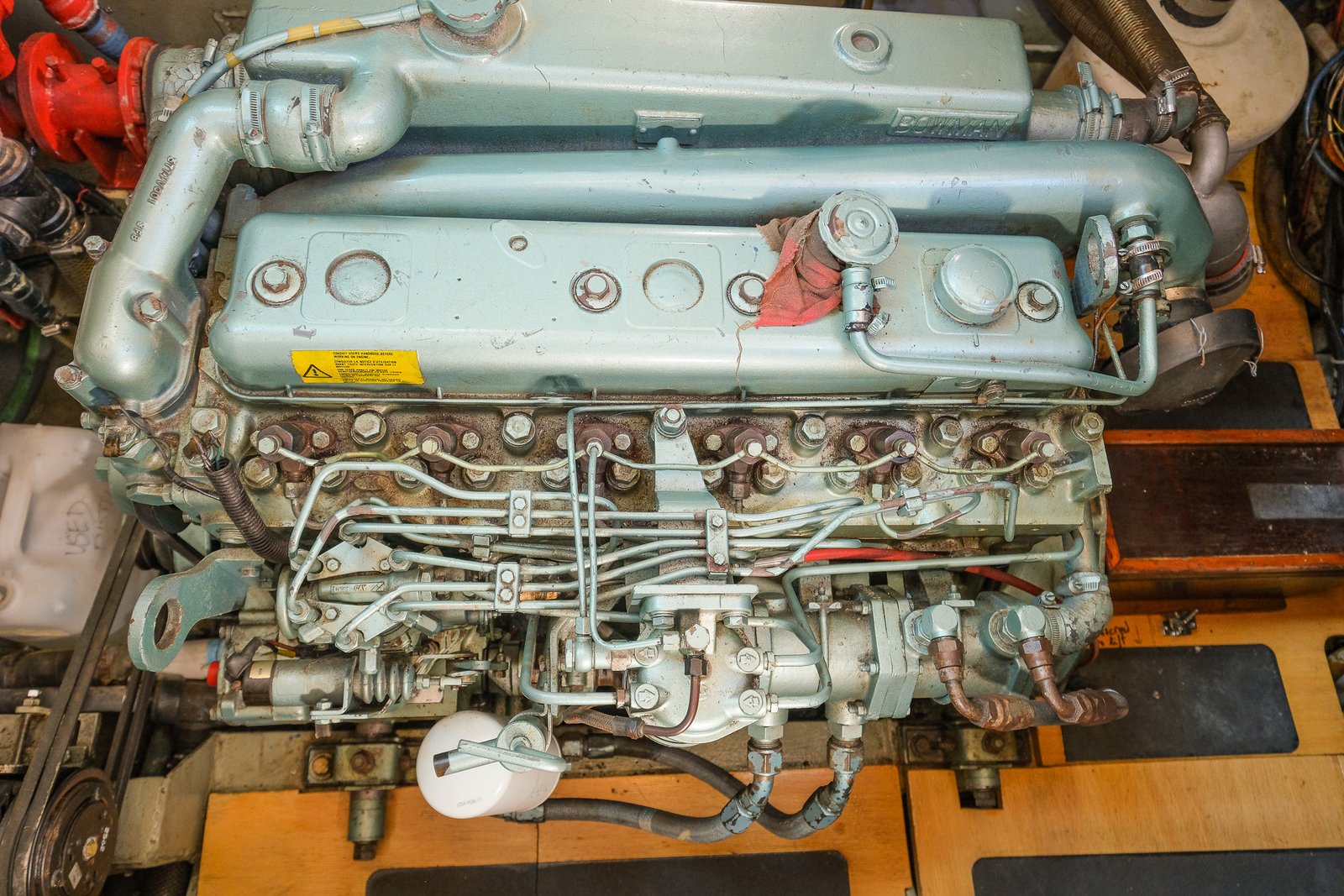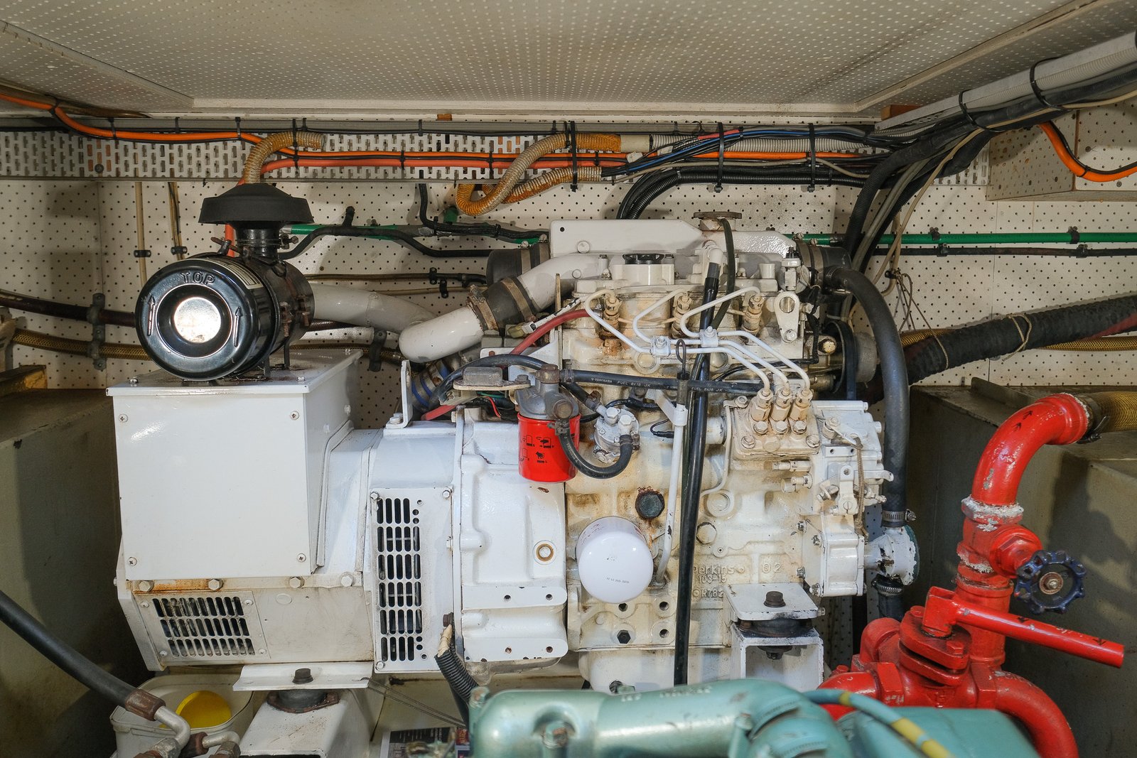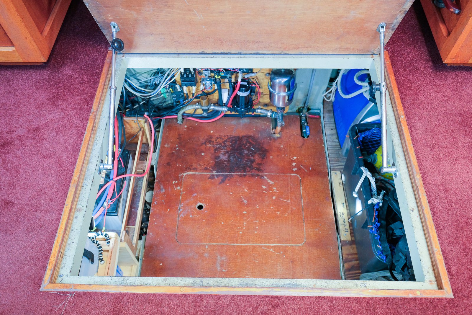 Beneath the pilothouse floor, you step down into a spacious and well-organized engine room. The space offers excellent access to both the main engine and genset, making routine maintenance straightforward. A significant portion of the vessel’s systems and equipment are also housed here, all clearly laid out and easily accessible for inspection or servicing.