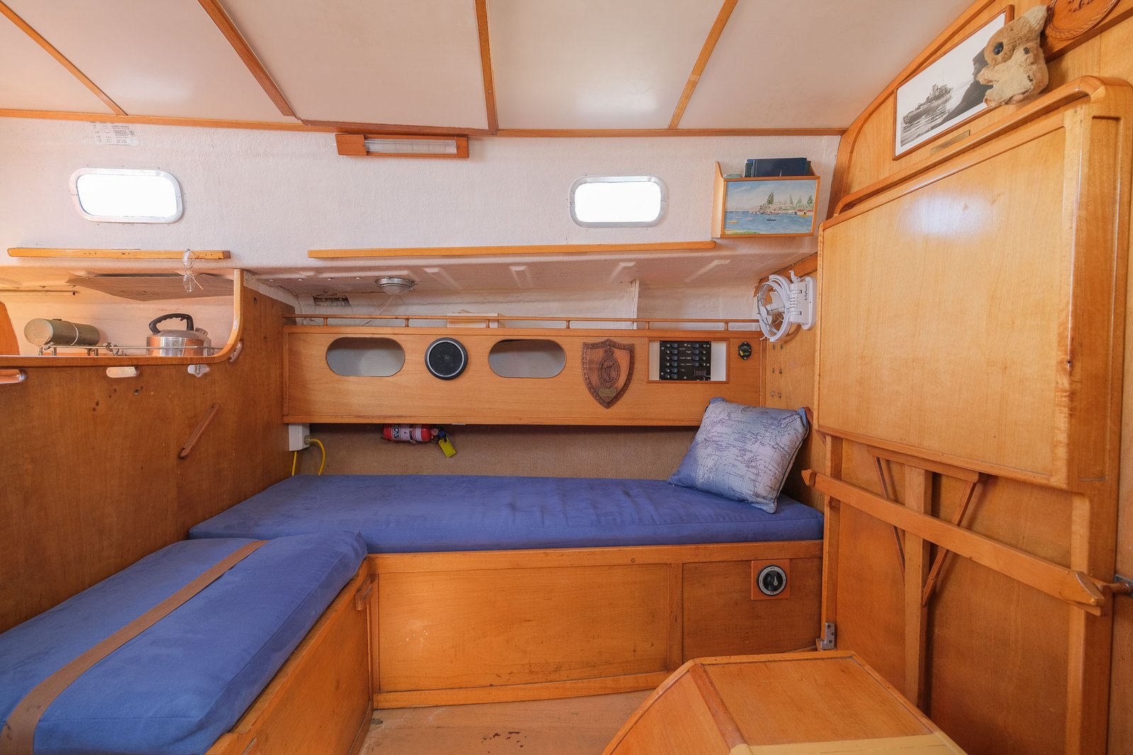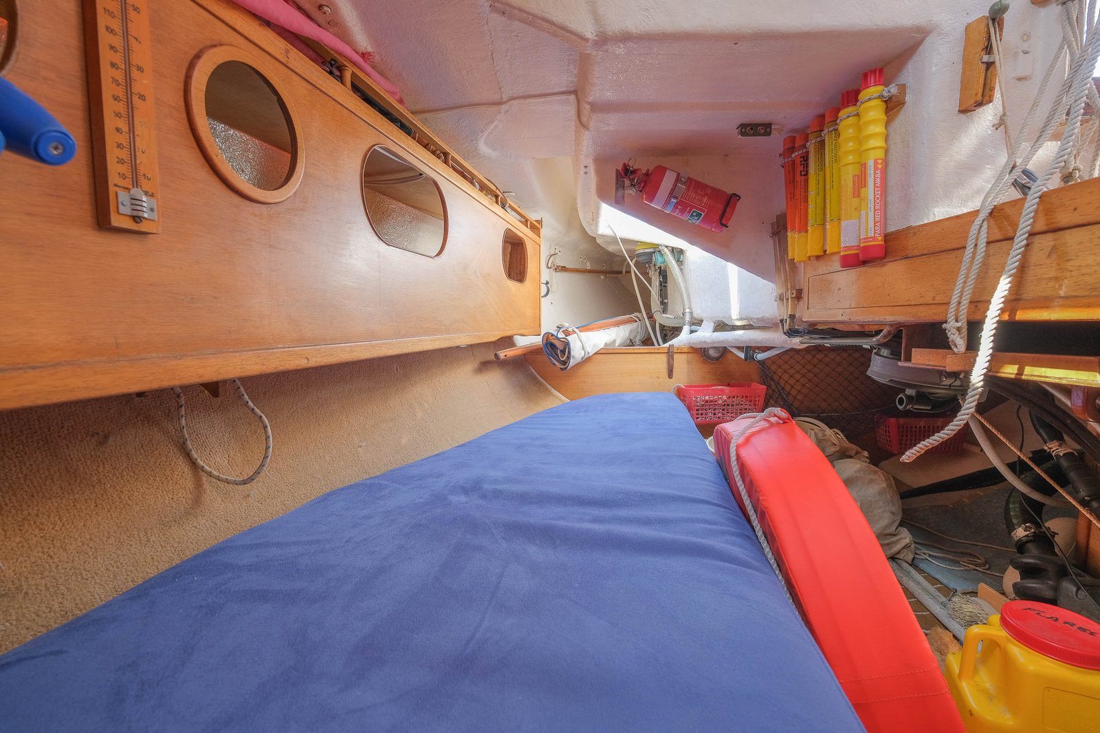 The galley in basic and functional. The two burner kero stove is all you need to cook a good basic meal or boil the jug, and you don’t have to worry about the safety concerns associated with having gas onboard. The refrigeration is a is a very unique and clever design. It works by filling the fridge half full of water, plugging it into shore power, and it will make a solid 60kg block of ice. Then depending on ambient temperature, the ice can hold the fridge down for up to four weeks without consuming a single amp of power.